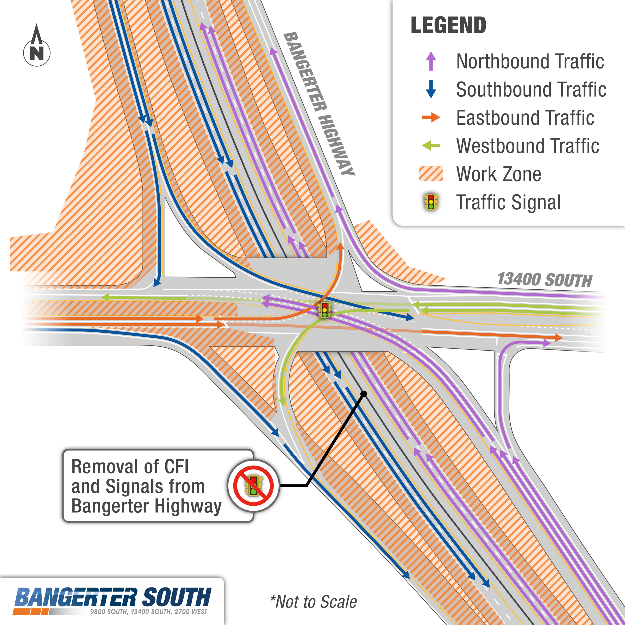 East/west traffic will reopen across Bangerter Highway (with lane restrictions). The northbound-Bangerter-to-westbound-13400-South continuous-flow intersection (CFI) turn will be permanently removed. Drivers will now exit to the right like a standard off-ramp and use the new signal at the bridge.