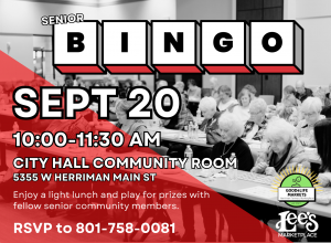 Senior Bingo Sep 20, 2023 10:00 AM - 11:30 AM Enjoy a light lunch and play for prizes with fellow senior community members. RSVP to 801-758-0081. |